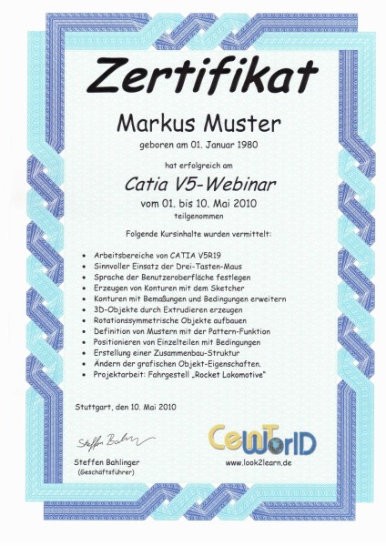 Qualifiziertes Zertifikat als PDF, wenn min. 70% der Leistung erbracht wurden. Das Lernprogramm läuft, ohne Installation, direkt auf jedem handelsüblichen Windows-PC.
